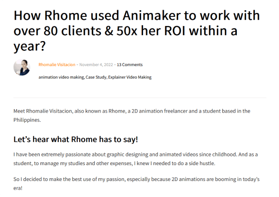 Rhomalie Visitacion, also known as Rhome, a 2D animation freelancer based in the Philippines was able to use animated videos to 50X her income in just one year while working with over 80 clients.